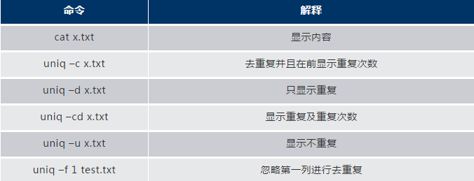 uniq需要配合sort進(jìn)行使用,把重復(fù)的內(nèi)容排序到一起,以下為最常用的幾個(gè)命令實(shí)例