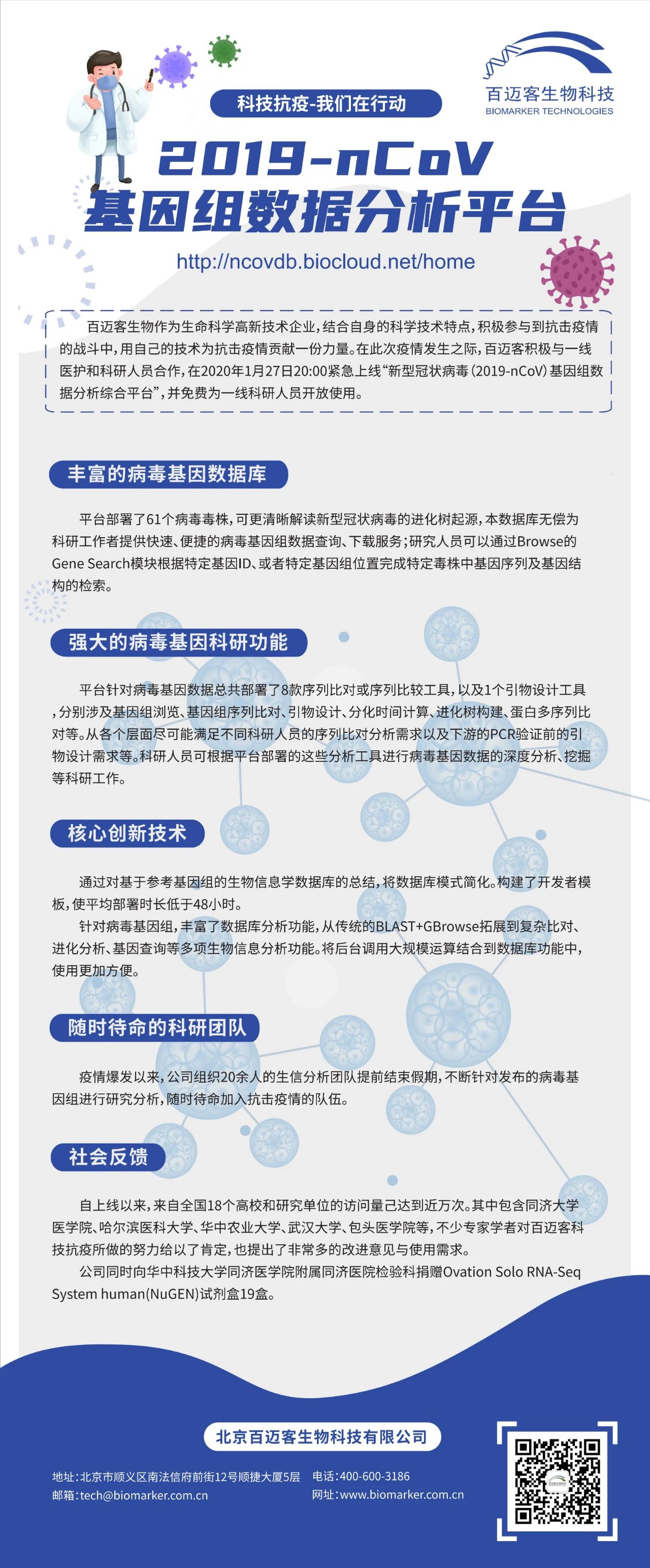 在疫情防控這個特殊的戰(zhàn)場,百邁客作為三代測序和生物云-BMKCloud服務(wù)提供商,結(jié)合自身的技術(shù)特點,在疫情爆發(fā)初期積極的參與到抗擊疫情的戰(zhàn)斗中,與一線的醫(yī)護和科研人員合作,結(jié)合一線的需求,積極調(diào)動各種資源,經(jīng)過十幾天夜以繼日的開發(fā),通過對各數(shù)據(jù)庫中的新型冠狀病毒數(shù)據(jù)進行合理整合分析,于2020年1月27日20:00時及時上線了首版“2019-nCoV新型冠狀病毒基因組數(shù)據(jù)分析平臺”(http://ncovdb.biocloud.net/home)?。本數(shù)據(jù)庫配合國家公共資源數(shù)據(jù)庫為社會提供更全面、及時、準確的數(shù)據(jù)資源。為我們的一線科研人員提供免費服務(wù)。
