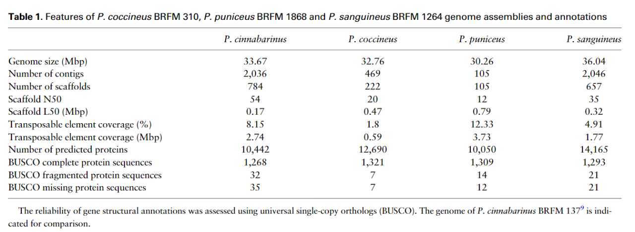 分別對P.coccineus、P.sanguineusand、P. puniceus、P.cinnabarinus的基因組進(jìn)行測序和組裝,四種真菌基因組大小差異不大,編碼基因組的數(shù)量上也比較接近。