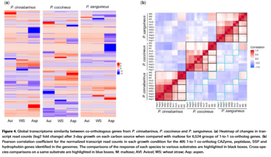 本文通過比較基因組,轉(zhuǎn)錄組和蛋白組等多組學(xué)方法對擔(dān)子菌門下的密孔菌屬的真菌進(jìn)行研究,發(fā)現(xiàn)它們在木材降解反應(yīng)中存在著一些保守的酶學(xué)反應(yīng)特征,包括產(chǎn)過氧化氫酶和耗過氧化氫酶協(xié)同作用,纖維二糖脫氫酶和AA9溶解性多糖單氧酶協(xié)同作用。