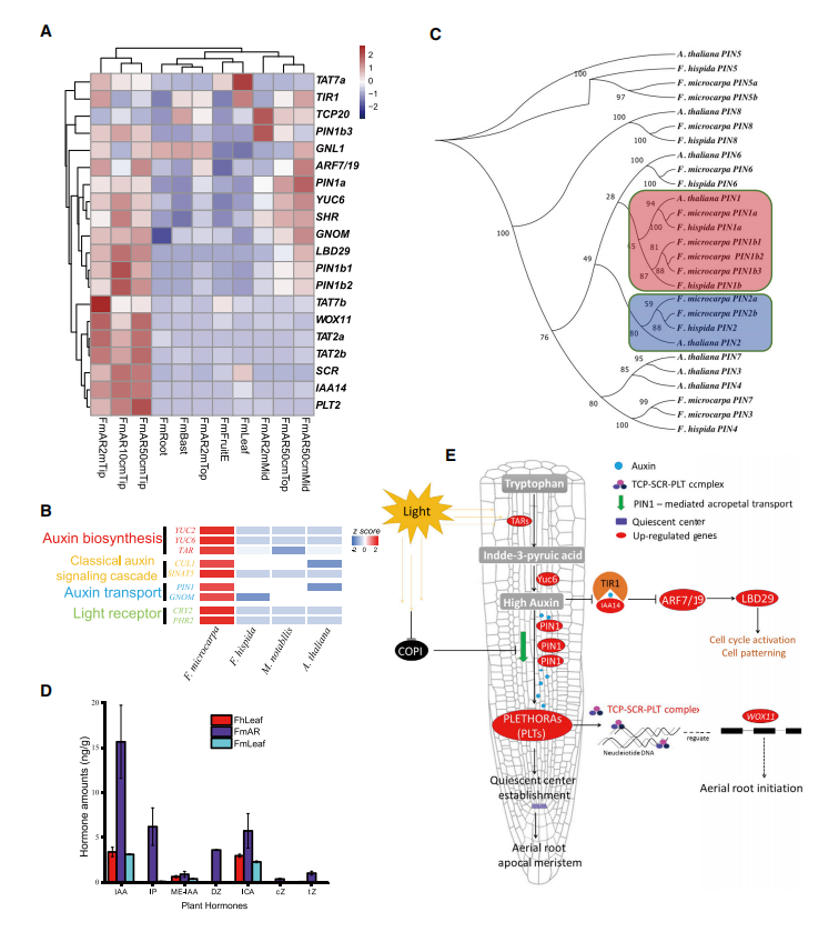 細(xì)葉榕與對(duì)葉榕顯著差異表現(xiàn)為前者有氣生根而后者沒(méi)有,為了尋找觸發(fā)氣生根的途徑,作者在氣生根尖鑒定到811個(gè)高表達(dá)基因。這些高表達(dá)的基因在一系列與運(yùn)輸相關(guān)的生物過(guò)程中顯著富集。通過(guò)對(duì)PIN家族的系統(tǒng)發(fā)育分析,發(fā)現(xiàn)PIN1基因存在顯著的拷貝數(shù)變異(CNV),并確定了兩個(gè)進(jìn)化的PIN1亞群。第一組(PIN1a)在兩種榕樹和擬南芥中均被鑒定到,第二組(PIN1b)僅于兩種榕樹中。RNA-seq表明,FmPIN1a在大多數(shù)被測(cè)組織中均有表達(dá),而FmPIN1b1、FmPIN1b2和FmPIN1b3在氣生根樣品中高表達(dá)。光受體CRY2和PHR2的拷貝數(shù)增加,TAR(如TAT2a、TAT2b和TAT7b)和YUC編碼基因(如YUC6)的表達(dá)增加進(jìn)一步加速了IAA的積累,與對(duì)葉榕相比,細(xì)葉榕氣生根尖的內(nèi)源生長(zhǎng)素濃度高出5倍。說(shuō)明生長(zhǎng)素的增加引發(fā)了氣生根的發(fā)育,光促進(jìn)的生長(zhǎng)素依賴途徑與氣生根的發(fā)生、生長(zhǎng)和形態(tài)形成有關(guān)。