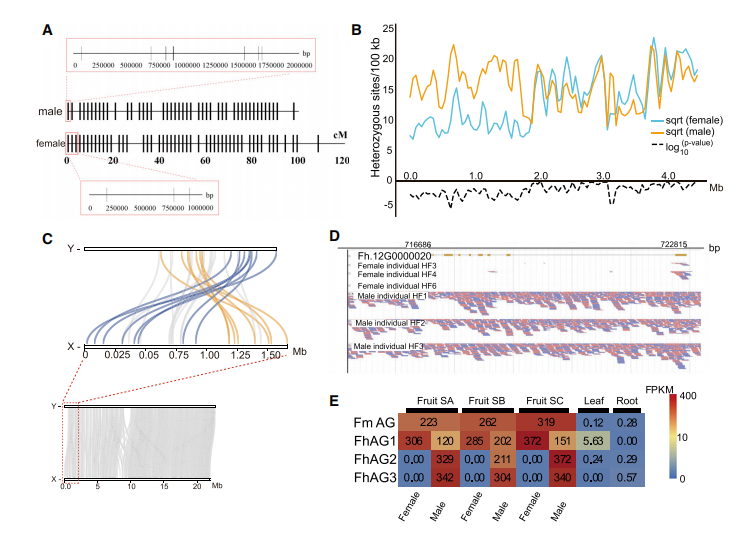 此外,作者新開發(fā)了染色體定相方法并重新組裝了X和Y染色體。X染色體和Y染色體中分別為21.9 Mb和22.6 Mb,表明Y染色體已經(jīng)擴(kuò)展了700 kb(圖3C)。比較X和Y染色體,結(jié)合存在或缺失變異(PAV)分析及RNA-seq分析以及重測(cè)序比對(duì),顯示蛋白編碼基因(Fh.12g000020)基因只存在于雄性基因組中,而不存在于雌性基因組中,是影響性別決定的主要因素(圖3E)。