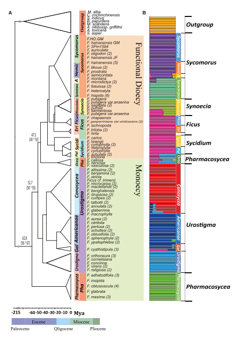 利用112份榕樹材料的基因組重測(cè)序數(shù)據(jù),建立了榕樹的系統(tǒng)發(fā)育史,其中包括62種榕樹屬,包括2個(gè)雌雄同株亞屬(Pharmacosycea, Urostigma)和4個(gè)雌雄異株亞屬(Sycidium,Sycomorus, Synoecia?,Ficus),它們代表了榕樹的6個(gè)亞屬和主要分支。白肉榕亞屬(Pharmacosycea)被分至兩類,進(jìn)化樹、ADMIXTURE、遺傳相關(guān)性分析及ABBA-BABA分析發(fā)現(xiàn)了整個(gè)屬存在潛在廣泛的種間雜交。系統(tǒng)發(fā)育揭示了雌雄同株代表了整個(gè)屬的祖先繁殖系統(tǒng)(圖4)。分化時(shí)間顯示,始新世時(shí)期(約47.5 Mya)出現(xiàn)了雌雄同株和雌雄異株的分化。