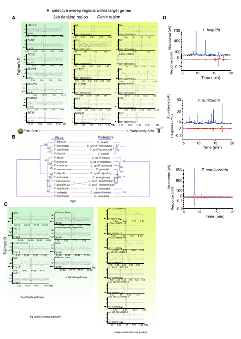 七千五百萬(wàn)年來(lái),榕樹和榕小蜂之間的專性協(xié)同進(jìn)化在這個(gè)協(xié)同進(jìn)化系統(tǒng)中形成了形態(tài)和生理上的相適應(yīng)。榕樹在全球和當(dāng)?shù)囟加袠O高的物種多樣性,同域近緣榕果物種間生殖隔離的主要原因是傳粉蜂的特異性。為了探討榕果與傳粉蜂協(xié)同進(jìn)化的潛在分子機(jī)制,作者利用14個(gè)來(lái)自Sycomorus亞屬的榕樹和其相應(yīng)傳粉蜂的重測(cè)序數(shù)據(jù)進(jìn)行分析。系統(tǒng)發(fā)育分析表明,在這個(gè)分類水平上,寄主關(guān)聯(lián)具有很強(qiáng)的保守性,同時(shí)也檢測(cè)到一些寄主轉(zhuǎn)移事件。為了確定在這些協(xié)同進(jìn)化的物種中可能經(jīng)歷了相互選擇和分化的候選基因,作者利用Tajima’D和SweeD分析對(duì)榕果和傳粉蜂基因組進(jìn)行了選擇性清除分析,顯示在榕果和傳粉蜂中生長(zhǎng)相關(guān)的基因、榕果揮發(fā)物相關(guān)基因和傳粉蜂化學(xué)感應(yīng)系統(tǒng)相關(guān)基因受到一定的選擇作用。并通過(guò)榕小蜂對(duì)三種不同榕果釋放揮發(fā)物質(zhì)的電生理測(cè)試,支持了甲羥戊酸和莽草酸途徑在吸引特定傳粉者方面的重要作用(圖5),揭示了在這種專性互利共生中共分化的潛在分子機(jī)制。