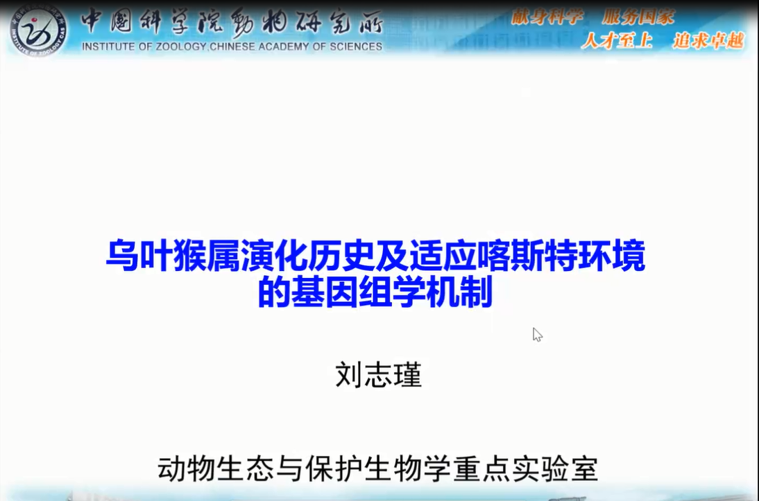 中國(guó)科學(xué)院動(dòng)物研究所劉志瑾副研究員詳述了烏葉猴屬中黑葉猴種組、銀葉猴種組、郁烏葉猴種組三個(gè)種組演化地位和種群動(dòng)態(tài)。并對(duì)石山葉猴和雨林葉猴兩大類群以及黑葉猴種組的分化情況進(jìn)行了深入闡述。研究最后推斷EDNRB基因是在自然選擇過程中,在白頭葉猴遺留下來的環(huán)境適應(yīng)性毛色表型的關(guān)鍵機(jī)制。劉老師的報(bào)告使相關(guān)領(lǐng)域?qū)W者對(duì)靈長(zhǎng)類生態(tài)分類群中的基因-環(huán)境相互作用和生理-形態(tài)適應(yīng)機(jī)制有了新的認(rèn)識(shí)。