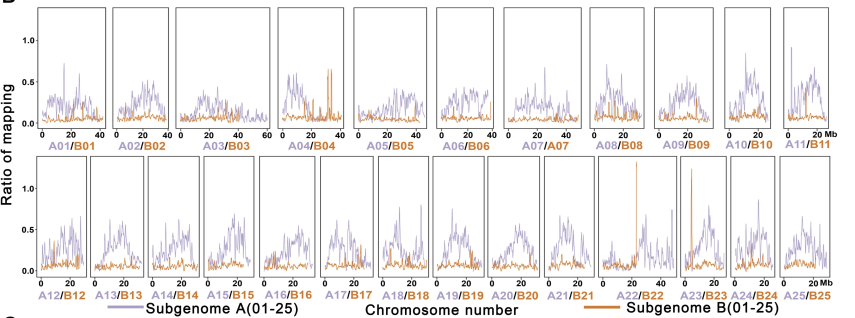 在過(guò)去的50年里,一直推測(cè)金魚(yú)基因組是四倍體。近期研究表明,鲃亞科Barbinae (2n = 50) 中的鯉魚(yú)科可能是金魚(yú)最接近的二倍體祖先,進(jìn)而形成這樣一個(gè)假說(shuō):鲃亞科(Barbinae)可能是二倍體金魚(yú)譜系的祖先種,研究中進(jìn)一步進(jìn)行了6個(gè)代表性的二倍體鲃亞科物種(包括條紋小鲃,大鱗高須魚(yú),長(zhǎng)臀鲃,黑鰭袋唇魚(yú),施氏魮和裂峽鲃)的全基因組鳥(niǎo)槍測(cè)序并進(jìn)行基因組組裝。金魚(yú)染色體可清晰分為兩個(gè)亞基因組,通過(guò)reads多序列比對(duì),發(fā)現(xiàn)金魚(yú)來(lái)自兩個(gè)祖先世系,其中一個(gè)是鲃亞科共有的,進(jìn)一步將與鲃亞科比例高的reads所在染色體定為A亞基因組(ChrA01~A25)并將其余染色體定為B亞基因組 (ChrB01~B25)(圖2)。此外,基于1個(gè)核基因的系統(tǒng)進(jìn)化分析,即結(jié)締組織生長(zhǎng)因子like基因在二倍體金魚(yú)中僅有1個(gè)拷貝,但在四倍體金魚(yú)中含有2個(gè)拷貝,結(jié)果顯示鲃亞科物種的同源基因與金魚(yú)A亞基因組同源基因聚類(lèi)到一起(斑馬魚(yú)和鯉魚(yú)作外群)。研究結(jié)果表明,A亞基因組可能起源于鲃亞科內(nèi)的祖先物種,而B(niǎo)亞基因組的二倍體祖先可能已經(jīng)滅絕或起源于未知的鯉科魚(yú)類(lèi)譜系,推測(cè)金魚(yú)的起源可能是由于異源多倍化事件。金魚(yú)的A和B亞基因組分別包含28,133和26,141個(gè)基因。同時(shí)通過(guò)金魚(yú)10個(gè)不同組織的RNA-seq測(cè)序,探索了A和B兩個(gè)亞基因組之間的差異表達(dá),發(fā)現(xiàn)同源基因在兩個(gè)亞基因組之間表現(xiàn)出不對(duì)稱的表達(dá)模式,而全基因組范圍內(nèi)的表達(dá)水平總體上更偏好A亞基因組。
