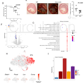 作者觀察到Cthrc1只在CF中而不在其他心肌細(xì)胞中表達,因此想要探討Cthrc1在CF中的功能作用。文中通過Cthrc1敲除小鼠(KO)研究發(fā)現(xiàn)在生長發(fā)育成年過程中大小、體積、心臟表型都沒有太大的變化,但是心肌梗死后KO小鼠的存活率顯著下降(80% WT vs 30% KO),這與KO梗塞心臟左心室游離壁膠原沉積的顯著減少有關(guān)。GO富集分析發(fā)現(xiàn),與WT相比較,KO CF在MI 涉及到細(xì)胞分化、增殖以及蛋白合成信號通路富集有顯著性差異,并且通過TGF-β1誘導(dǎo)的KO CF在血管生成、肌肉收縮、血管系統(tǒng)發(fā)育等相關(guān)通路基因明顯下調(diào),表明KO CF對TGF-β1反應(yīng)調(diào)控能力降低。單細(xì)胞RNA測序進一步分析了4189個處于7dpi的KO CF,與WT相比較,RCF類的細(xì)胞百分比增加了(21% KO vs 14 WT)。RCF類的CF和其他活化CF的亞群(如POSTN +)都在Cthrc1-KO梗死小鼠的IZ和BZ中被發(fā)現(xiàn)了,這也就說明了心室破裂的表型來源于CTHRC1 的缺失。因此,Cthrc1的缺失與ECM組織、膠原生物合成和TGF-介導(dǎo)的調(diào)控有關(guān)的基因下調(diào)密切相關(guān)。這也證實了RCF通過分泌CTHRC1介導(dǎo)心臟修復(fù)影響ECM分子的沉積和合成,促進CF的增殖。