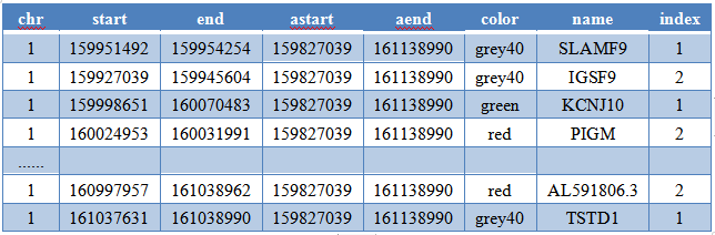 首先用你能用的辦法將目標(biāo)區(qū)域(1:160000000-161000000)內(nèi)的基因、目標(biāo)區(qū)域上游的兩個基因、目標(biāo)區(qū)域下游的一個基因的位置都提取出來,然后為每個基因賦一個顏色。中間灰色的bar兩端的突出可以從第一個基因的開始位置向上游擴100K、最后一個基因的結(jié)束位置向下游擴100K。整理成作圖用的輸入文件,如下: