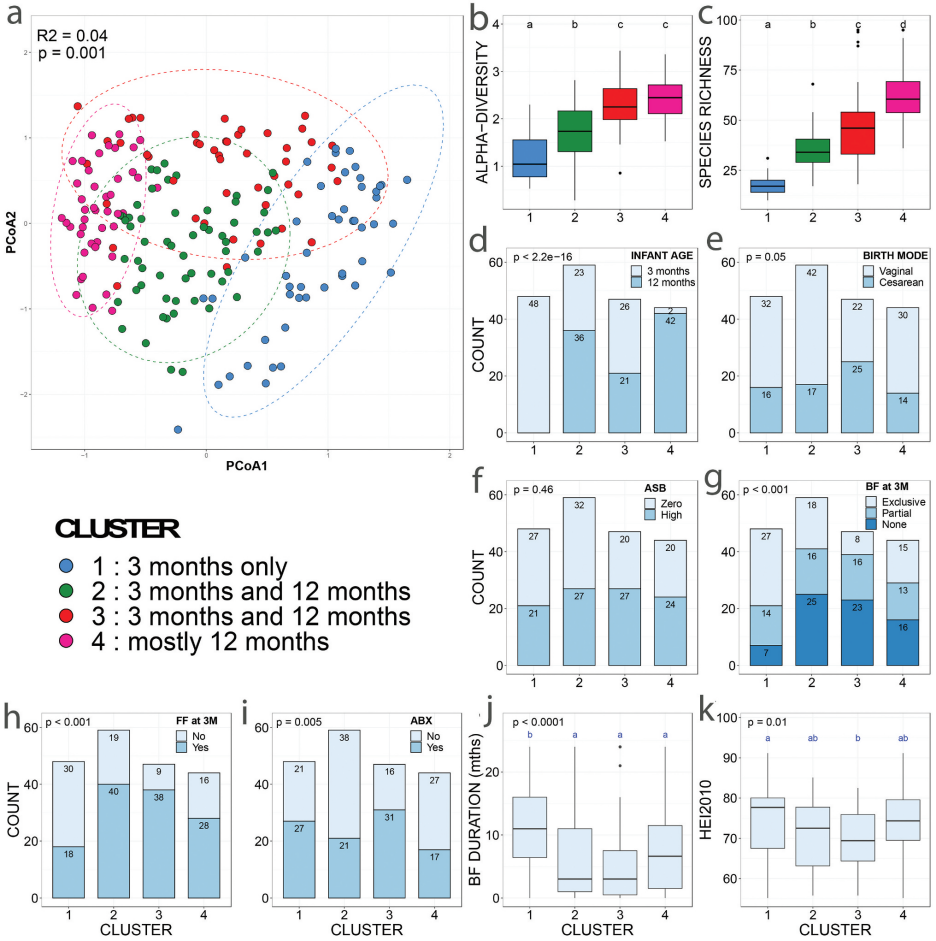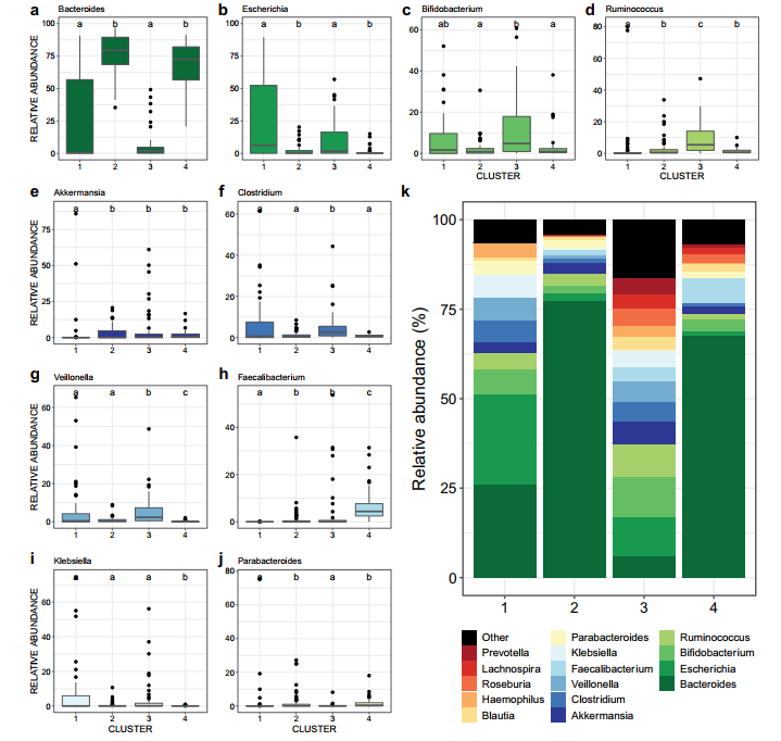 基于微生物群落組成,嬰兒糞便樣品聚類成四組(圖1-2)。腸道細菌物種豐富度(圖1b)、alpha(圖1c)、beta(圖1a)和分類學組成(圖2)在clusters之間存在差異,反應了顯著的菌落差異。Cluster1僅包含了3個月的樣本、cluster4幾乎包括所有12個月的樣本,cluster2和3由3個月和12個月的樣本混合組成。Cluster3包括較高比例的分娩時期使用抗生素的母親、剖腹產(chǎn)出生的嬰兒和配方奶粉喂養(yǎng)(圖1)。然而,在不同clusters中母親ASB消耗量沒有差異,這表明這種暴露并不影響clusters的分類(圖1f)。