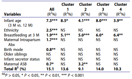 接下來,作者對不同cluster進行了beta多樣性分析。Envfit單變量模型為每個cluster確定了不同的驅(qū)動因素(圖3a)。Cluster1中beta多樣性的驅(qū)動因素主要是母親因素,而cluster4的驅(qū)動因素主要是嬰兒因素(圖3a)。Cluster2是唯一的母親ASB攝入與beta多樣性相關,單變量分析和多變量分析均得到證實(圖3a和表2)。