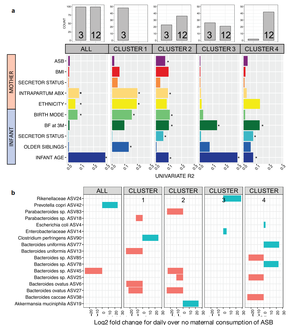 Envfit分析(單變量模型)確定了13個變量作為腸道細菌多樣性的重要驅(qū)動因素,從中我們選擇了8個非冗余變量來構(gòu)建我們的模型:嬰兒年齡、母親生產(chǎn)時使用抗生素、母親的種族、分娩方式、3個月時母乳喂養(yǎng)狀況、是否有兄弟姐妹、嬰兒分泌物狀況和母親的ASB消耗量(圖3a)。完整的數(shù)據(jù)集中顯著的預測因素是嬰兒的年齡、母親的種族、生產(chǎn)時使用抗生素和分娩方式。同樣的四個變量加上3個月時母乳喂養(yǎng)狀況,在一個多變量模型中進行了測試,解釋了14.2%群落變異(表2)。僅在多變量模型中,母親食用ASB是嬰兒腸道細菌組學的顯著預測因子(表2)。分娩方式、生產(chǎn)時抗生素和3個月時母乳喂養(yǎng)狀況也對群落組成有顯著影響,但低于嬰兒年齡和母親種族(表2)。