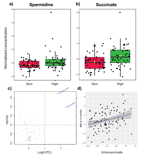 使用MetaboAnalyst軟件確定了20種不同的代謝物。由于代謝組中的功能特征反應了微生物代謝的冗余性,并且不太容易受到分類學數(shù)據(jù)集典型個體間差異的影響,作者測試了3個月和12個月時母親ASB消耗量對完整數(shù)據(jù)顯著的影響。兩種尿液代謝物亞精胺和琥珀酸在暴露于ASB的3個月嬰兒中顯著升高(圖4)。