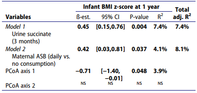 最后,在完整數(shù)據(jù)集上使用一個多變量線性模型,作者測試了母親ASB消耗量、微生物群落組成、與高ASB消耗量關聯(lián)的兩種代謝物與1歲嬰兒BMI z-score間的關系。此隊列中嬰兒出生時體重與一歲時的BMI沒有相關性。然而,多變量線性模型證實母親ASB日消耗量與嬰兒較高的BMI相關,并表明BMI與12個月時微生物組成有關但與3個月時無關(表3)。值得注意的是,琥珀酸與BMI呈正相關,與亞精胺無關,表明這種關聯(lián)也可能涉及微生物來源的代謝物(表3和圖4d)。