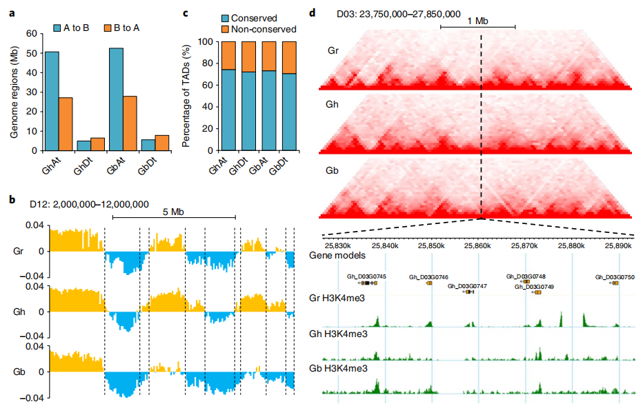 與祖先材料做研究比較更是多倍體中亙古不變的話題。物種在由祖先進(jìn)化、加倍而成現(xiàn)代多倍體材料的過程中,三維結(jié)構(gòu)發(fā)生如何的變化,是否引起相關(guān)功能的差異?例如相比于二倍體亞洲棉陸地棉和海島棉的A/B compartment比較分析,發(fā)現(xiàn)存在大量A到B的轉(zhuǎn)換,以及一定區(qū)域出現(xiàn)了B到A的轉(zhuǎn)換。同時相對于祖先基因組,亞基因組發(fā)生了不同程度的Compartment的轉(zhuǎn)換,At亞基因組轉(zhuǎn)換明顯高于Dt。