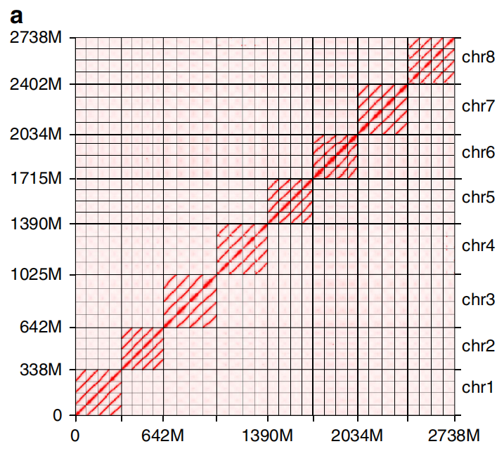 大多研究是天然材料材料,這種就難以構(gòu)建如上遠(yuǎn)源雜交的親系。PacBio平臺的HiFi技術(shù)基于其高準(zhǔn)確率,無需reads間進(jìn)行糾錯,從而可以更為有效區(qū)分同源對之間的差異,再結(jié)合現(xiàn)有的Hifiasm、HiCanu等具有更強(qiáng)的區(qū)分單倍型的組裝軟件,使得多倍體的多套組裝成為了可能。例如同源四倍體紫花苜蓿使用~22X CCS(HiFi)reads進(jìn)行基因組組裝后用ALLHiC進(jìn)行同源染色體聚類,最終組裝出四套單倍型[5]。李恒等大牛發(fā)布Hi-C結(jié)合HiFi的 DipAsm算法也為二倍體物種染色體規(guī)模的分相組裝提供了可能[6]。