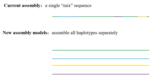 同源多倍體是指所有染色體組來源于一個個體的染色體組自我復(fù)制或同一個物種內(nèi)不同個體間的雜交與多倍化。通常二倍體基因組裝出單套基因組,異源四倍體能組裝出兩套基因組。而由于早期的技術(shù)限制,同源多倍體物種往往只能組裝1-2套(例如2017年甘薯基因組)。隨著技術(shù)的發(fā)展以及研究的深入,研究者發(fā)現(xiàn)僅單套的基因組數(shù)據(jù)難以完全演示該物種的全面信息。尤其是一些同源多倍體的物種,同源染色體之間不同遺傳位點(diǎn)的組合對生物表型有重要影響,如動植物中的雜種優(yōu)勢、某些物種雜交不育現(xiàn)象等。單倍型等位基因間差異對基因表達(dá)、功能及其表型都有著重要影響,大多數(shù)雜交品種的優(yōu)勢表型都受等位基因調(diào)控。