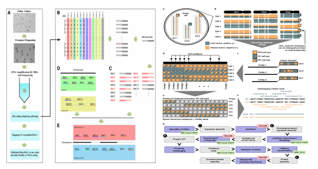 Bar-coding:將花粉單細(xì)胞結(jié)合構(gòu)建的人工染色體(BAC,artificialchromosome)進(jìn)行單倍型分型。Strand-seq:短reads結(jié)合單細(xì)胞通過胸苷類似物選擇性標(biāo)記去除一條DNA鏈,并可與長reads測序數(shù)據(jù)結(jié)合使用來完成單倍型分型。