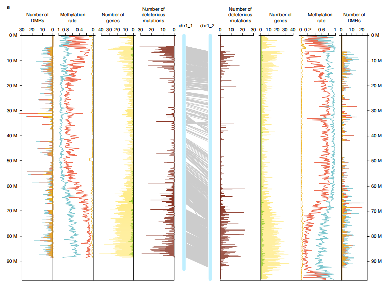 隨著單倍型的解析,不少研究發(fā)現(xiàn)在同源染色體間有大量的變異信息,而這些突變累積很可能引起等位基因的有害/有益替代。從而可以對亞基因組(同源染色體)間基因含量、GC含量、基因結(jié)構(gòu)、重復(fù)元件分布等比較、亞基因組間結(jié)構(gòu)變異(倒置、易位),結(jié)合TE分布等進(jìn)行亞基因組(同源染色體)間差異分析。
