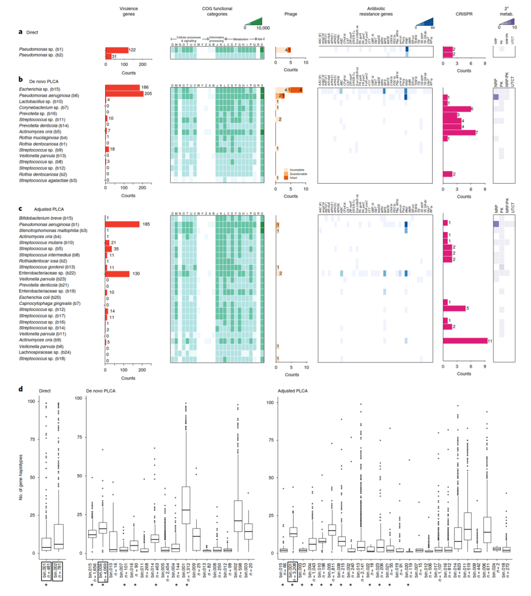 通過(guò)富集培養(yǎng)獲得的分類學(xué)多樣性的增加直接轉(zhuǎn)化為該微生物群落功能信息的增加(圖6)。富集培養(yǎng)測(cè)序在直系同源蛋白簇(COGs)、毒力基因、抗生素抗性基因、CRISPRs和次級(jí)代謝功能方面獲得更大的多樣性和功能鑒定數(shù)量。先前的研究已經(jīng)證實(shí)囊性纖維化氣道以及整個(gè)人類微生物群中存在單一物種的異質(zhì)性群體。作者通過(guò)鑒定基因單倍型來(lái)計(jì)算每個(gè)宏基因組bin的遺傳變異性(圖6d)。在一些宏基因組bins中,作者鑒定到一個(gè)一致的和少量的基因單倍型,表示這個(gè)bin代表一個(gè)單一的基因組群體(即一個(gè)菌株)。在大多數(shù)bins中,作者觀察到大量的單倍型多樣性,指示異質(zhì)性群體,即多菌株。不出所料,這些區(qū)域中每個(gè)基因的單倍型數(shù)量是多種多樣的,這表明細(xì)菌基因組內(nèi)進(jìn)化壓力的已知范圍。平均而言,假單胞菌屬種中鑒定出更多的基因單倍型,富集培養(yǎng)的bins比直接測(cè)序更多。然而,直接測(cè)序鑒定了大量的普遍存在的單倍型基因離群值。Bin的完整性與平均單倍型頻率沒(méi)有相關(guān)性。