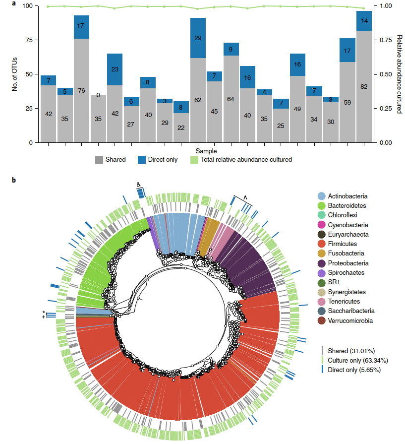 作者判斷OTU可培養(yǎng)的條件:1)至少10條序列;2)至少1個(gè)富集板中回收到且豐度比例至少為0.01%。直接測(cè)序鑒定到的OTU中82.13%是可培養(yǎng)的,這些可培養(yǎng)的在所有直接測(cè)序的樣本中平均豐度比例為99.3%(圖2a),富集培養(yǎng)擴(kuò)增子測(cè)序比直接測(cè)序獲得更多的OTUs(圖2b),如樣本1恢復(fù)到49個(gè)OTUs,其中42個(gè)在富集培養(yǎng)中也恢復(fù)到,富集培養(yǎng)還恢復(fù)了額外的124個(gè)OTUs(圖2a)。