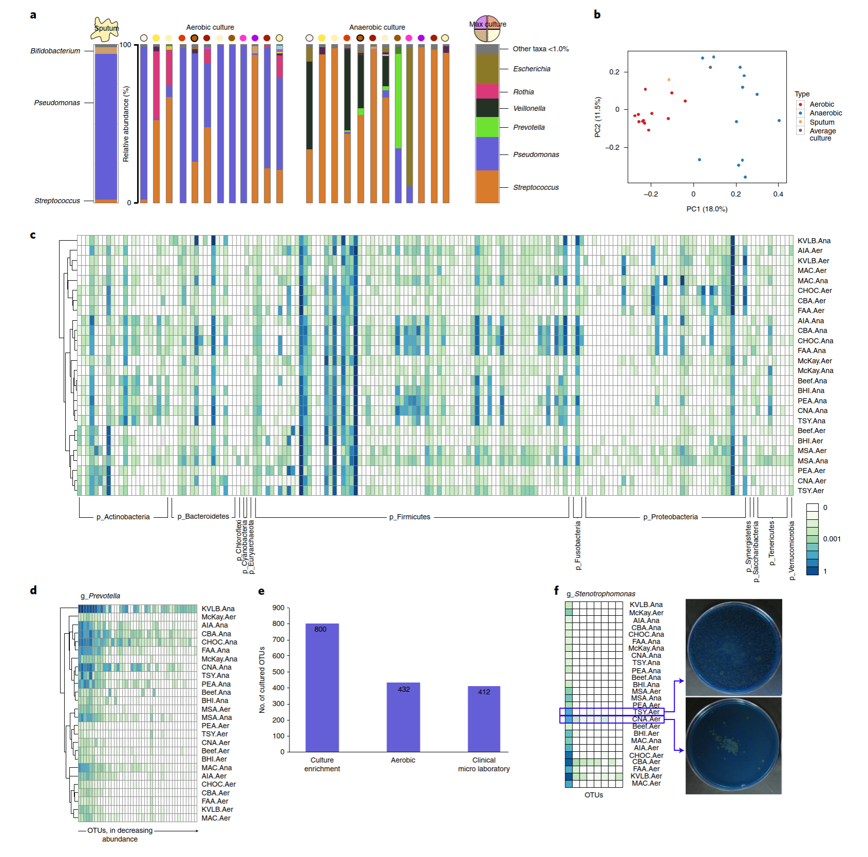 培養(yǎng)基類型和培養(yǎng)環(huán)境對(duì)于微生物菌群多樣性是重要的。富集培養(yǎng)和直接16S測(cè)序結(jié)果中物種分布和β多樣性結(jié)果表明有氧和厭氧條件促進(jìn)了不同的物種恢復(fù)(圖3a,b)。不同培養(yǎng)基類型的物種進(jìn)行聚類顯示選擇性培養(yǎng)和非選擇性培養(yǎng)的重要性(圖3c),有些屬的生長(zhǎng)模式也存在OTU依賴差異(如普氏菌屬,圖3d)。作者在臨床實(shí)驗(yàn)室常用的4種典型培養(yǎng)條件的基礎(chǔ)上,擴(kuò)展了培養(yǎng)條件,獲得將近2倍的OTUs(圖3e)。富集培養(yǎng)的另一個(gè)優(yōu)點(diǎn)是可以從凍存細(xì)菌中回收感興趣的微生物。嗜麥芽窄食單胞菌從兩個(gè)凍存的脫脂牛奶塊中分離得到,其相對(duì)豐度比例很低(1.3%和1.5%),牛奶塊在特定的培養(yǎng)基類型培養(yǎng)(圖3f)。