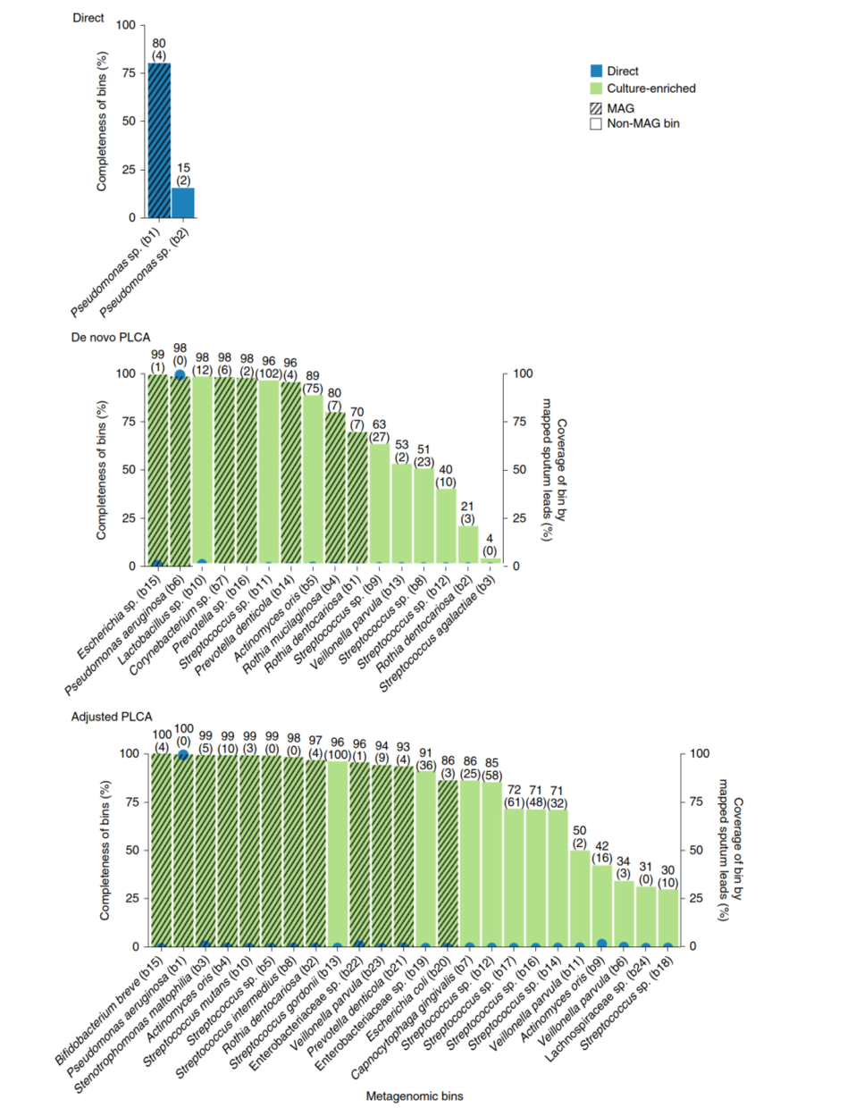 作者將擴(kuò)增子測(cè)序與富集培養(yǎng)宏基因組測(cè)序相結(jié)合研究人類微生物群落。以肺囊性纖維化為例,平均培養(yǎng)了82.13%的可操作分類單元(OTUs),占痰液樣本直接測(cè)序所鑒定的相對(duì)豐度的99.3%,更重要的是,與直接測(cè)序相比,富集培養(yǎng)方法鑒定的OTUs多了63.3%。作者開(kāi)發(fā)了平板覆蓋算法(PLCA),以確定富集培養(yǎng)平板的代表性子集,從而在該子集上進(jìn)行宏基因組研究。與不依賴培養(yǎng)的方法相比,可以恢復(fù)更多的物種多樣性(包含更好的低豐度物種的組裝基因組,MAGs),更長(zhǎng)的重疊群和更好的功能注釋結(jié)果。PLCA算法也可以應(yīng)用于此前發(fā)布的腸道菌群數(shù)據(jù)集,富集培養(yǎng)分子圖譜可以更好的了解微生物菌群在人類健康和疾病中的作用。