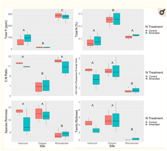 全磷、全氮、C:N比值、AMF的系統(tǒng)發(fā)育指數(shù)、物種豐富度和科水平物種豐富度在不同地點(diǎn)均有顯著差異。置換方差分析(PERMANOVA)結(jié)果表明,N處理對(duì)ASV?的UniFrac群落差異無(wú)顯著影響;而群落的不相似性與土壤全氮的含量顯著相關(guān)。