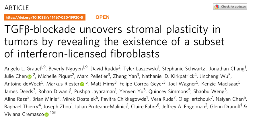 總之,這些數(shù)據(jù)表明,TGFβ-阻斷可導(dǎo)致小鼠和人類腫瘤成纖維細(xì)胞的重塑,暴露了一種獨(dú)特的CAF群體的誘導(dǎo),其特征是對(duì)IFN的明顯反應(yīng)和相當(dāng)大的免疫調(diào)節(jié)潛能。