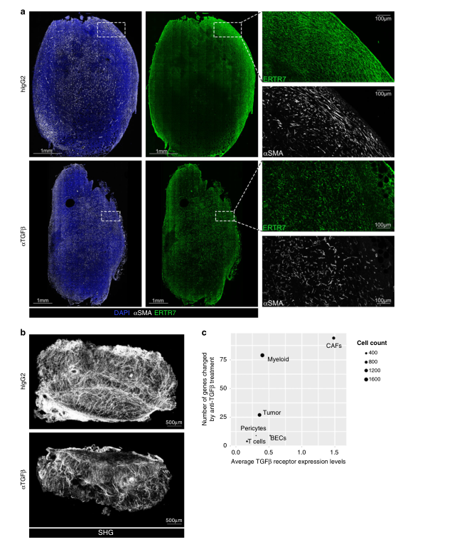 根據(jù)觀察到的基因表達(dá)變化,作者利用冷凍保存的腫瘤從同型或抗tgfβ處理小鼠切片,染色和共聚焦顯微鏡成像等方法確定了TGFβ-阻斷是否對(duì)構(gòu)成腫瘤建筑框架結(jié)構(gòu)產(chǎn)生損傷。Acta2表達(dá)的鏡像變化,肌成纖維細(xì)胞網(wǎng)絡(luò)的顯著改變,細(xì)長(zhǎng)的紡錘形細(xì)胞稀少等揭示了瘤內(nèi)結(jié)構(gòu)組織的顯著變化,表明TGFβ阻斷抗體處理小鼠的高網(wǎng)狀纖維網(wǎng)絡(luò)丟失(圖3a)。通過對(duì)全器官的斷層掃描,進(jìn)一步證實(shí)了膠原骨架形成的整體損傷,如圖3b所示。單細(xì)胞RNAseq分析結(jié)果表明基因的數(shù)量受anti-TGFβ治療明顯更大 (圖3 c),也與先前的結(jié)果一致。