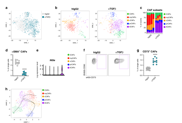 5.?TGFβ-阻斷導(dǎo)致myCAFs的丟失和CD73 +成纖維細(xì)胞的出現(xiàn)