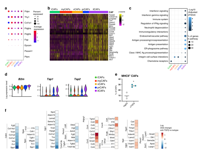 為了獲得關(guān)于新鑒定的CAF亞群功能特性的更多信息,作者研究了這類亞群的轉(zhuǎn)錄特征。然而,對(duì)ilCAFs中差異表達(dá)基因分析發(fā)現(xiàn),在干擾素(IFN)信號(hào)控制下許多鳥苷晚結(jié)合蛋白(Gbp)家族成員發(fā)生富集(圖5b)。與這些發(fā)現(xiàn)一致的是,在區(qū)分ilCAFs與其他CAF亞群的基因中, ilCAFs中IFN信號(hào)反應(yīng)上調(diào),IFN水平調(diào)控的通路增強(qiáng),包括抗原加工和展示(圖5c)。編碼MHC蛋白和MHC相關(guān)分子的基因在ilCAFs中高表達(dá)(圖5b-d)。體內(nèi)TGFβ-阻斷后,在CAFs中檢測(cè)到MHCII蛋白上調(diào)(圖5e),也發(fā)現(xiàn)ilCAFs在腫瘤內(nèi)對(duì)指導(dǎo)T細(xì)胞的轉(zhuǎn)運(yùn)發(fā)揮重要作用(圖5b)。