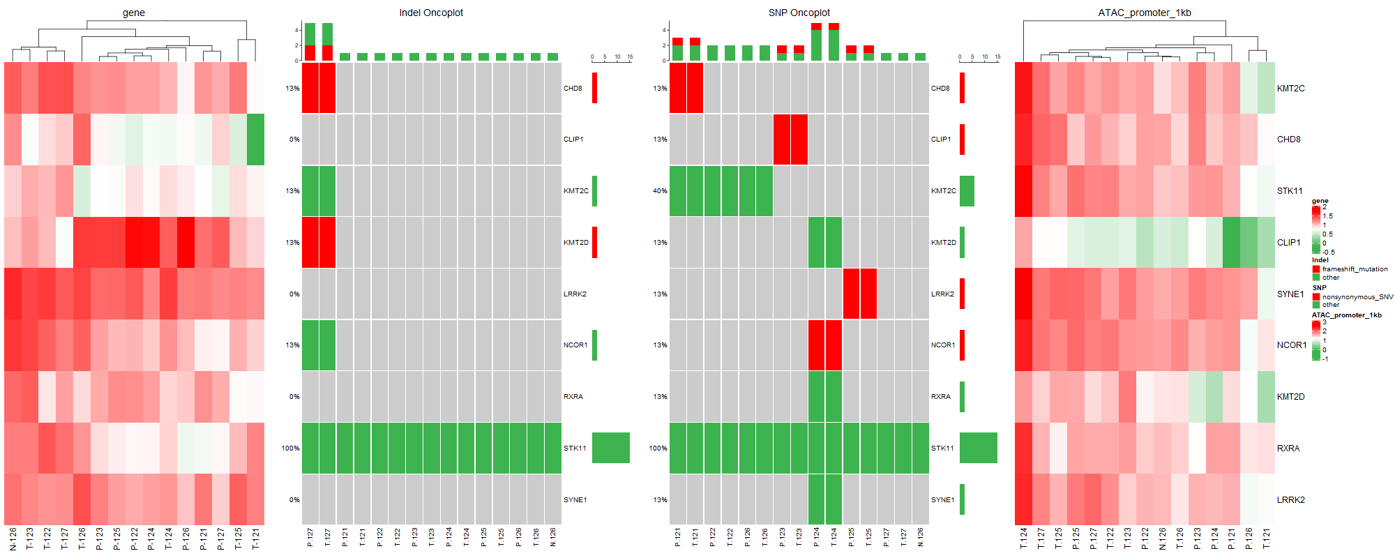 其中需要注意的是當有多個基因瀑布圖時,alter_fun和col需在同一條命令中設(shè)置。通過以上一頓操作,快速將基因瀑布圖和熱圖組合在一起,既展示了基因的結(jié)構(gòu)變異、開放狀態(tài)、基因表達,呈現(xiàn)多組學的角度探討疾病發(fā)生發(fā)展。這不就完成了Fig1還升華了Fig1的深度。