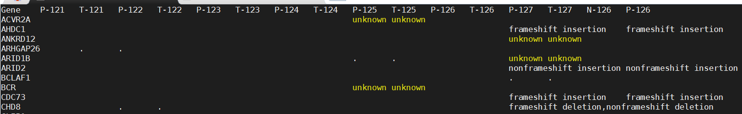 mat<-Replace(mat,from?=?"nonframeshift?deletion,frameshift?deletion",to?=?"frameshift_mutation",pattern?=?"")