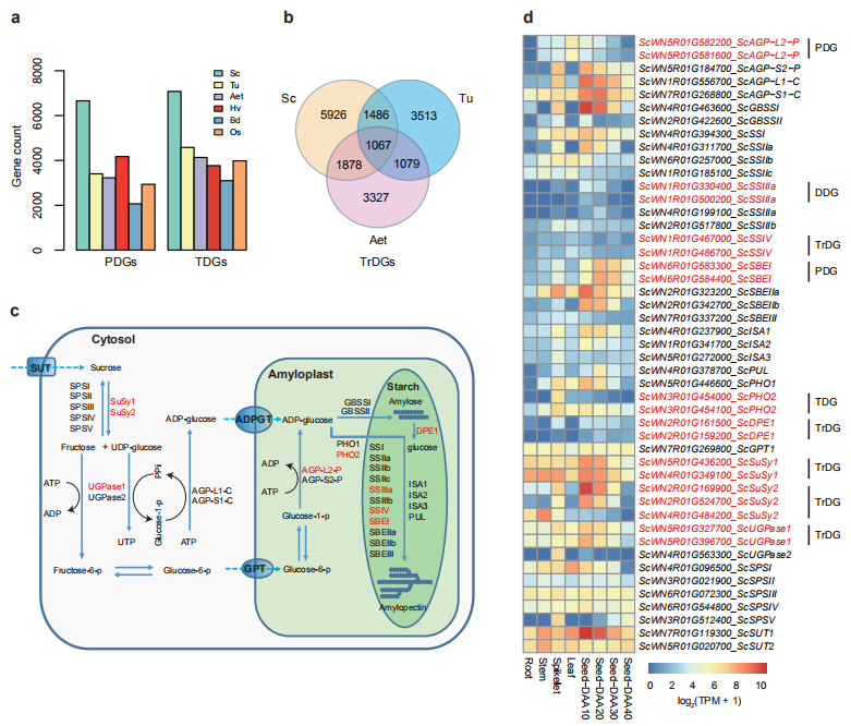 接下來作者研究了黑麥淀粉生物合成相關(guān)基因(SBRGs)中的基因復(fù)制。研究發(fā)現(xiàn)這些重復(fù)類型在黑麥淀粉生物合成相關(guān)基因(SBRGs)中普遍存在,并且不同的SBRG的復(fù)制基因之間往往表現(xiàn)出表達(dá)差異,說明不同類型的基因復(fù)制可以豐富黑麥基因在重要生物過程中的遺傳多樣性(圖4c),這些黑麥SBRGs的新變化可能為調(diào)控植物淀粉生物合成和性質(zhì)提供新的酶活性,因此解析全套黑麥SBRGs有利于提高黑麥的產(chǎn)量潛力和營養(yǎng)品質(zhì)。