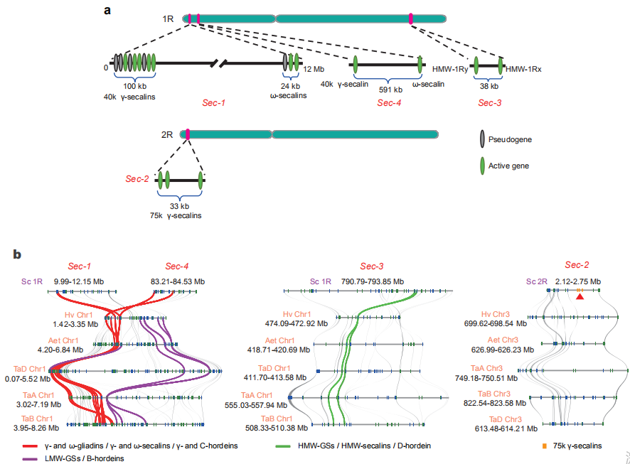 在威寧黑麥中未發(fā)現(xiàn)小麥低分子量麥谷蛋白亞基(LMW-GSs)或大麥B-hordein的同源序列(圖5b),表明在黑麥進(jìn)化過程中攜帶這些基因的染色體片段缺失,這可能是1BL1RS易位系小麥品種中,品質(zhì)受影響的主要原因。并且在威寧黑麥基因組中未發(fā)現(xiàn)α-醇溶蛋白基因,這說明小麥及其近緣種的α-醇溶蛋白(α-gliadin)基因可能在小麥和黑麥分化之后進(jìn)化產(chǎn)生的。這些SSP分析結(jié)果闡明了黑麥堿基因座的結(jié)構(gòu)和組成,這將有助于進(jìn)一步研究黑麥、小黑麥和小麥的加工和營養(yǎng)品質(zhì)。