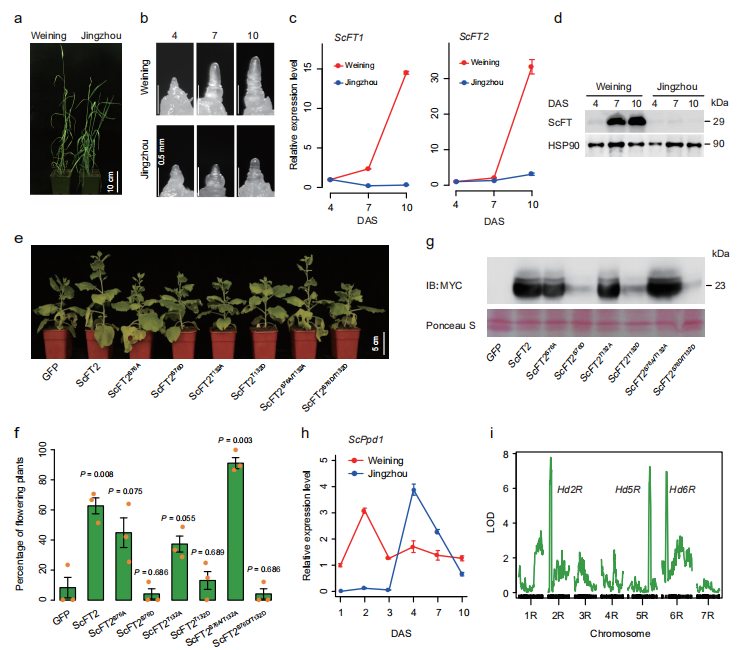 在長(zhǎng)日照條件下,威寧黑麥比荊州黑麥提前抽穗10-12天(圖6a),這與威寧黑麥莖尖分生組織發(fā)育更快有關(guān)(圖6b)。在威寧黑麥基因組中,注釋到在長(zhǎng)日照條件下高表達(dá)的兩個(gè)開花位點(diǎn)(FT)基因ScFT1(ScWN4R01G446100)和ScFT2(ScWN3R01G192500)。播種后7天和10天,ScFT1和ScFT2在威寧黑麥中的表達(dá)水平顯著高于荊州黑麥(圖6c),且ScFT蛋白在黑麥中積累到相對(duì)較高水平,而荊州黑麥中幾乎沒有(圖6d)。檢測(cè)到的ScFT蛋白的大?。▇29 kDa)比預(yù)測(cè)出的ScFT1和ScFT2的分子量大(~19 kDa)(圖6d),表明ScFT蛋白具有潛在的翻譯后修飾。用高效檢測(cè)磷蛋白的磷酸標(biāo)記SDS-PAGE分析表明,威寧黑麥中ScFT確實(shí)發(fā)生了翻譯后磷酸化修飾。