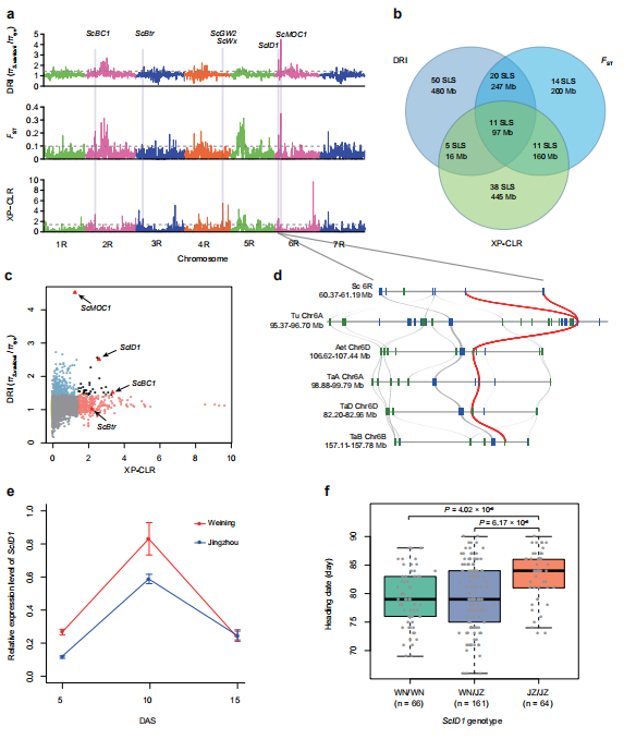 對(duì)馴化基因的分析可以促進(jìn)對(duì)作物性狀的理解和改良,但在黑麥中這類基因的分子分析方面進(jìn)展甚微。作者通過全基因組選擇清除分析,利用在栽培黑麥和瓦維洛夫黑麥(S. vavilovii)之間鑒定的123647個(gè)SNPs,挖掘黑麥馴化相關(guān)染色體區(qū)域和基因座。DRI、FST、XP-CLR分析中,共同識(shí)別到11個(gè)選擇信號(hào)(圖7a-c)。通過與水稻和大麥的共線性比較,發(fā)現(xiàn)了一些可能的選擇清除位點(diǎn),包括已在水稻或大麥中已被功能分析的ScBC1、ScBtr、ScGW2、ScMOC1、ScID1和ScWx的同源基因(圖7a-c)。