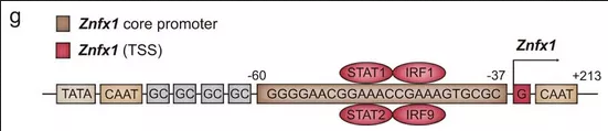 為了確定哪些核苷酸和區(qū)域Znfx1轉(zhuǎn)錄中很重要,使用promoter 2.0( http://www.cbs.dtu.dk/services/promoter/)、JASPAR(http://jaspar.genereg.net/)和CpGplot(http://www.ebi.ac.uk/Tools/seqstats/emboss_cpgplot/)進(jìn)行識(shí)別,其中包含TATA框、GC框和CAAT框的Znfx1的-1,064~+63之間的區(qū)域,是啟動(dòng)子。對(duì)轉(zhuǎn)錄因子結(jié)合位點(diǎn)的進(jìn)一步分析表明,Znfx1的啟動(dòng)子在相對(duì)集中和重疊的區(qū)域中包含STAT1、STAT2、IRF1和IRF9結(jié)合基序?;谶@些分析,構(gòu)建了一個(gè)Znfx1啟動(dòng)子報(bào)告基因載體,包含?1,064~+63之間的區(qū)域,以及一個(gè)突變的報(bào)告基因構(gòu)建體,其中缺失了STAT1、STAT2、IRF1和IRF9結(jié)合motif。接下來(lái),STAT1,STAT2,IRF1或IRF9過(guò)表達(dá)質(zhì)粒和2個(gè)報(bào)告基因載體轉(zhuǎn)染293T細(xì)胞,報(bào)告基因分析表明,在STAT1、STAT2、IRF1或IRF9存在的情況下,報(bào)告基因的表達(dá)可以由Znfx1啟動(dòng)子誘導(dǎo),而不能由缺少轉(zhuǎn)錄因子結(jié)合位點(diǎn)的啟動(dòng)子載體誘導(dǎo)(圖1l)??偠灾琙NFX1是一個(gè)ISG,其病毒感染后的上調(diào)取決于JAK1-STAT1級(jí)聯(lián)反應(yīng)。