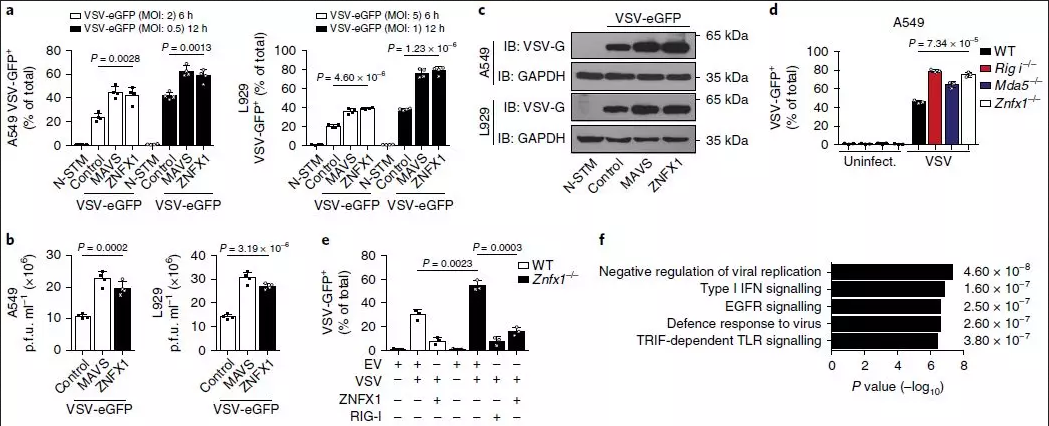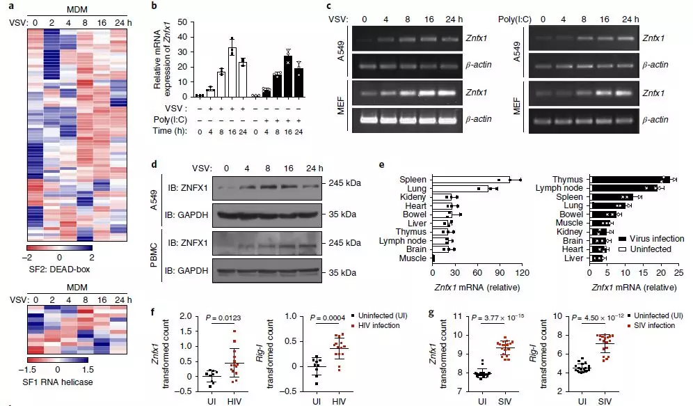 為了更深入地了解ZNFX1在抗病毒應(yīng)答中的作用,進(jìn)行了qRT-PCR或免疫印跡分析,以了解VSV感染或干擾素誘導(dǎo)劑聚肌胞苷酸(poly(I:C))刺激A549細(xì)胞、外周血單個(gè)核細(xì)胞(PBMC)或小鼠胚胎成纖維細(xì)胞(MEF)細(xì)胞后ZNFX1的表達(dá)上調(diào)(圖1b–d)。qRT-PCR也證實(shí)了靜脈注射VSV后小鼠脾臟和肺中Znfx1的豐度上調(diào)(包括胸腺、淋巴結(jié)脾臟和肺)(圖1e)。作者還對(duì)先前收集的芯片數(shù)據(jù)集(GDS4231/4214/1271/3210/6082/6063)進(jìn)行了統(tǒng)計(jì)分析,發(fā)現(xiàn)與健康對(duì)照相比,在HIV感染患者和猿猴免疫缺陷病毒(SIV)引起的腦炎猴子中,Znfx1的RNA水平明顯更高(圖1f,g)。此外,在不同的細(xì)胞類(lèi)型(包括巨噬細(xì)胞、樹(shù)突狀細(xì)胞和上皮細(xì)胞)中感染病毒后,Znfx1的轉(zhuǎn)錄顯著增加。這些數(shù)據(jù)都表明ZNFX1可能是抗病毒分子。