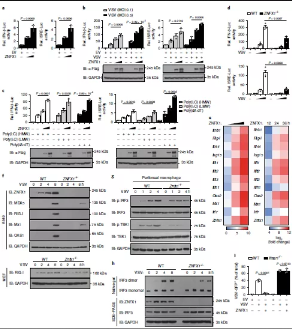 為了研究ZNFX1在IFN信號(hào)傳導(dǎo)中的作用,通過(guò)ZNFX1過(guò)表達(dá)質(zhì)粒和Ifnb1-reporter或IFN刺激的應(yīng)答元件(ISRE)報(bào)告質(zhì)粒瞬時(shí)轉(zhuǎn)染A549細(xì)胞進(jìn)行螢光素酶報(bào)告基因分析,然后進(jìn)行或不進(jìn)行VSV感染。結(jié)果表明,ZNFX1的過(guò)表達(dá)輕微激活了Ifnb1啟動(dòng)子和ISRE報(bào)告基因(圖4a)。此外,ZNFX1以劑量依賴(lài)的方式顯著增強(qiáng)了由VSV、2種類(lèi)型的poly(I:C)或poly(dA:dT)觸發(fā)的Ifnb1啟動(dòng)子激活(圖4b,c)。相反,敲除Znfx1可降低VSV誘導(dǎo)的293T細(xì)胞中Ifnb1報(bào)告基因和ISRE報(bào)告基因的激活(圖4d)。Ifnb1和ISGs的轉(zhuǎn)錄以劑量和時(shí)間依賴(lài)性的方式誘導(dǎo)(圖4e),當(dāng)ZNFX1在A549細(xì)胞中過(guò)表達(dá)時(shí)隨著劑量和時(shí)間增強(qiáng)反之敲除ZNFX1則降低。而與野生型細(xì)胞相比,Znfx1-/-A549和MEF細(xì)胞中ISG蛋白表達(dá)量分別減少(圖4f)。VSV感染后Znfx1-/-巨噬細(xì)胞中TBK1和IRF3的磷酸化低于野生型巨噬細(xì)胞(圖4g)。在VSV感染的Znfx1-/-293T細(xì)胞中,IRF3的二聚化也低于野生型細(xì)胞(圖4h)。野生型A549細(xì)胞中觀察到了VSV的限制性復(fù)制,但在Ifnar1-/-A549細(xì)胞中未觀察到(圖4i)。所有這些數(shù)據(jù)表明,ZNFX1通過(guò)誘導(dǎo)I型IFN的產(chǎn)生而參與抗病毒免疫反應(yīng),其抗病毒特性也取決于IFN信號(hào)傳導(dǎo)。