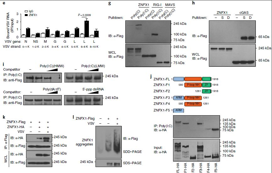 為了進(jìn)一步評(píng)估與ZNFX1結(jié)合的病毒RNA的性質(zhì),首先將核酸類(lèi)似物連接的磁珠與經(jīng)Flag標(biāo)記的ZNFX1、RIG-I或MAVS過(guò)表達(dá)的293T細(xì)胞裂解液一起孵育,并進(jìn)行了pulldown試驗(yàn)以顯示ZNFX1和RIG-I蛋白與poly(I:C)結(jié)合,但不與poly(C)結(jié)合(圖5g)。cGAS而非ZNFX1結(jié)合單鏈和雙鏈DNA(ISD,一個(gè)45 bp的雙鏈DNA;圖5h)。競(jìng)爭(zhēng)實(shí)驗(yàn)顯示ZNFX1蛋白與HMW poly(I:C)優(yōu)先結(jié)合,而不是與LMW poly(I:C)、poly(dA:dT)或5’pppdsRNA優(yōu)先結(jié)合(圖5i)。為了找到ZNFX1的poly(I:C)結(jié)合位點(diǎn),準(zhǔn)備了ZNFX1的截短版本并進(jìn)行了poly(I:C) pulldown實(shí)驗(yàn)。結(jié)果表明,ZNFX1與poly(I:C)的結(jié)合需要ARM域和P環(huán)結(jié)構(gòu)域,而不是ZF鋅指域(圖5j)。病毒感染后ZNFX1的寡聚化增強(qiáng)(圖5k,1)。因此,ZNFX1充當(dāng)RNA病毒傳感器,它傾向于結(jié)合長(zhǎng)RNA分子。