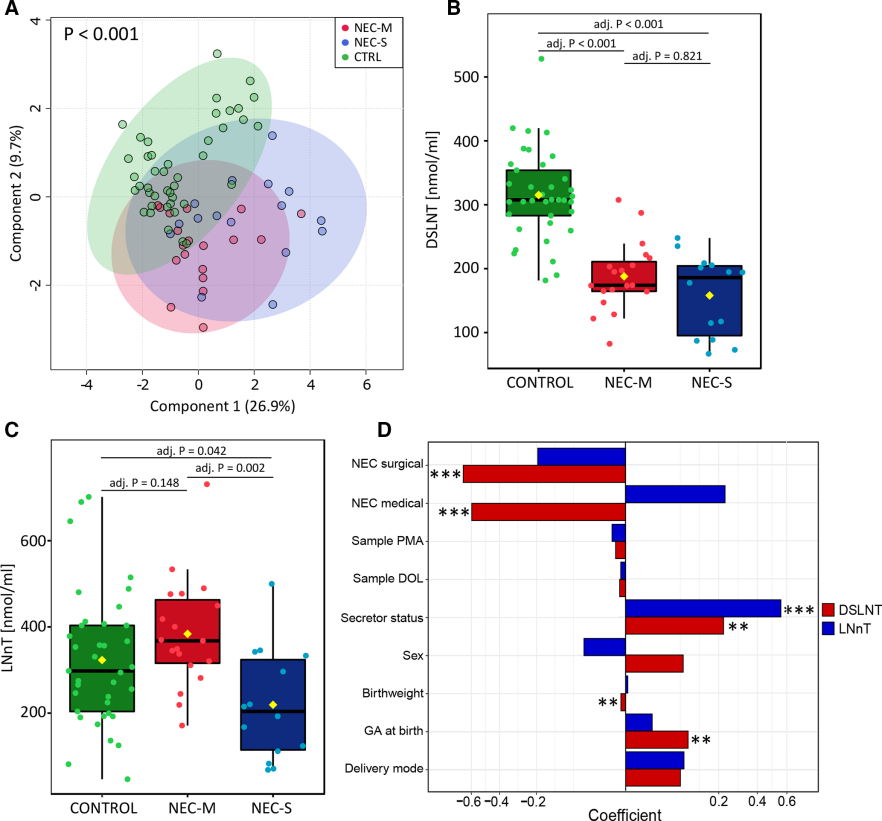 作者隨后通過調(diào)整線性模型研究了DSLNT和LNnT濃度與臨床變量之間的潛在關(guān)聯(lián)。DSLNT與兩種疾病類型呈負(fù)相關(guān),NEC-M的系數(shù)值為-0.60,NEC-S的系數(shù)值為-0.67(圖2D)。然而根據(jù)調(diào)整后的線性模型LNnT與疾病類型無關(guān)。分泌型母親中DSLNT和LNnT均顯著較高。母親的DSLNT與胎齡呈正相關(guān),與出生體重呈負(fù)相關(guān)。HMO與母親性別、分娩方式、胎齡和DOL均無相關(guān)性(圖2D)。