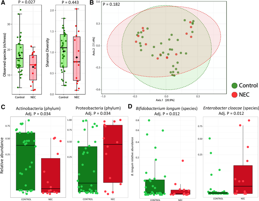 作者納入了含有HMO數(shù)據(jù)的嬰兒的糞便微生物組數(shù)據(jù),進(jìn)行獨(dú)立研究獲得宏基因組測序數(shù)據(jù)。14例NEC患兒和34例對照組的644個糞便樣本。NEC患兒物種豐富度顯著降低,shannon指數(shù)差異不顯著(圖3A)。PCoA分析顯示NEC和對照之間細(xì)菌菌群結(jié)構(gòu)差異不大(圖3B)。門水平分析顯示,相比于對照組NEC患兒Actinobacteria 相對豐度顯著降低,Proteobacteria 相對豐度顯著升高(圖3C)。種水平分析相比于對照組NEC患兒B. longum相對豐度降低,Enterobacter cloacae相對豐度升高(圖3D)。