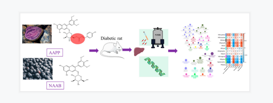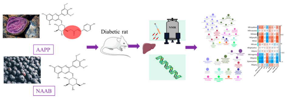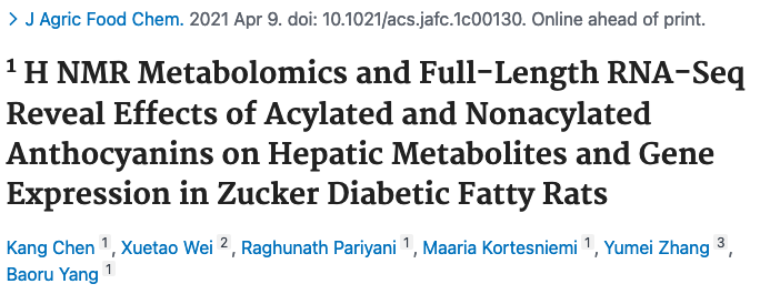 花色苷是植物中的一大類多酚化合物,目前已知是對氧化應(yīng)激、炎癥和能量穩(wěn)態(tài)有調(diào)節(jié)作用。已有報道發(fā)現(xiàn)花色苷具有抗糖尿病的療效?;ㄉ盏暮诵慕Y(jié)構(gòu)是花青苷,它可以糖基化形成非?;幕ㄇ嘬?,糖苷可以?;笮纬甚;幕ㄇ嘬?。且最近有研究表明,與未酰化的花青苷相比,?;ㄇ嘬站哂懈玫姆€(wěn)定性和抗氧化活性。本研究利用全長轉(zhuǎn)錄組學(xué)和核磁共振代謝組學(xué)方法,比較了非?;王;ㄉ諏μ悄虿〈笫蟾闻K基因表達(dá)和代謝的影響。這是第一次綜合應(yīng)用這兩種強(qiáng)大的技術(shù)來研究肝臟基因表達(dá)和代謝產(chǎn)物的變化。