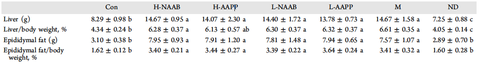 表1中可見,M組的肝臟和附睪脂肪重量及其占體重的百分比顯著高于CON組和ND組(p<0.05)。CON組的大鼠肝臟重量和肝/體比明顯高于ND組(P<0.05)。H-AAPP組大鼠肝/體重比明顯低于M組(p<0.05)。
