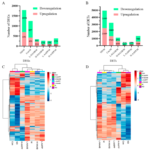 對全長轉(zhuǎn)錄組數(shù)據(jù)進(jìn)行分析發(fā)現(xiàn),在6個不同組之間的差異分析結(jié)果中,健康對照組和糖尿病模型之間有691個上調(diào)和1098個下調(diào)的DEGs,2469個上調(diào)和2483個下調(diào)的DETs (圖1A和B)。與M組相比,H-AAPP處理改變了最多的基因和轉(zhuǎn)錄本(101個上調(diào)和179個下調(diào)的DEGs,89個上調(diào)和780個下調(diào)的DETs)。DEGs和DETs的熱圖顯示,ND組和CON組在基因表達(dá)模式上與M組有很大不同,而且H-AAPP組的轉(zhuǎn)錄組圖譜似乎比M組更接近ND組和CON組(圖1C和D)。