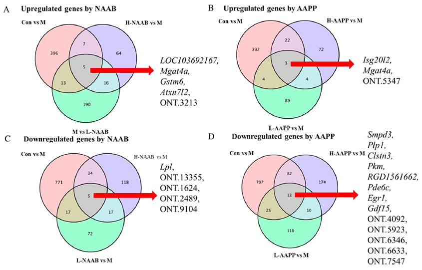 韋恩圖表明了不同分組之間上調(diào)和下調(diào)的DEG的交集,揭示了受NAAB和AAPP影響的特定基因(圖2A?D)。Gstm6與谷胱甘肽代謝、藥物代謝以及細(xì)胞色素P450對外源物質(zhì)的代謝有關(guān),在胰島素抵抗和糖尿病小鼠中均被報道下調(diào),并可能參與T2D的進(jìn)展。L-NAAB和H-NAAB均能恢復(fù)Gstm6的表達(dá)。與ND組和Con組相比,M組中有一個共同的基因被兩種花色苷提取物(NAAB和AAPP)上調(diào),即編碼N-乙酰氨基葡萄糖轉(zhuǎn)移酶GnT-4a的Mgat4a。在小鼠中,Mgat4a基因的遺傳失活導(dǎo)致葡萄糖轉(zhuǎn)運(yùn)蛋白2N-聚糖的錯誤組裝,導(dǎo)致葡萄糖轉(zhuǎn)運(yùn)蛋白2和質(zhì)膜凝集素Galectin 9之間的相互作用失敗,導(dǎo)致葡萄糖轉(zhuǎn)運(yùn)蛋白2內(nèi)化,從而抑制葡萄糖攝取和葡萄糖刺激的胰島素分泌。還發(fā)現(xiàn)高脂飲食抑制了Mgat4a的表達(dá)。藍(lán)莓的非?;ㄉ蘸妥仙R鈴薯的?;ㄇ嘬斩际侨绱恕>幋a脂蛋白脂肪酶的LPL在小鼠肝臟中過表達(dá),導(dǎo)致肝臟甘油三酯含量增加2倍,并導(dǎo)致胰島素抵抗,部分原因是對胰島素的反應(yīng)受損,抑制內(nèi)源性葡萄糖的產(chǎn)生。在本研究中,L-NAAB和H-NAAB都下調(diào)了ZDF大鼠高水平的LPL,這可能導(dǎo)致胰島素敏感性的改善。早期生長反應(yīng)基因-1(Egr1)可被胰高血糖素短暫激活,介導(dǎo)胰高血糖素調(diào)節(jié)的糖異生。AAPP降低Egr1,這可能與糖異生減少有關(guān)。