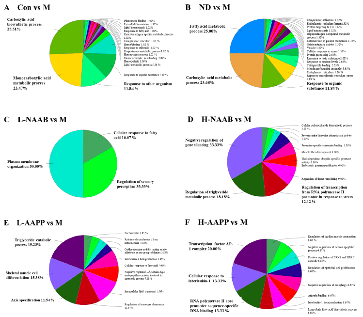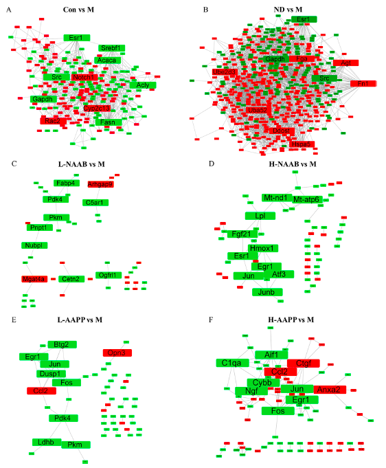 對不同分組中的DEGs進(jìn)行ClueGO分析,以生成按功能分組的注釋網(wǎng)絡(luò)圖(圖4A?F)。在CON/M差異分組的結(jié)果中,DEGs主要富集在羧酸生物合成過程、單羧酸代謝過程和對其他有機(jī)物的反應(yīng)過程。在ND/M分組差異結(jié)果中,脂肪酸代謝過程、羧酸代謝過程和對有機(jī)物的反應(yīng)過程是富集排名前3的功能分組。在ND/M和CON/M分組中,DEGs主要在單羧酸代謝過程、羧酸生物合成過程、脂肪酸代謝過程、脂肪代謝過程和對有機(jī)物的反應(yīng)過程相關(guān)的通路中富集。在L-NAAB/M分組差異結(jié)果中,DEGs組要與三個功能通過有關(guān):質(zhì)膜組織、感覺調(diào)節(jié)和細(xì)胞對脂肪酸的反應(yīng)。在H-NAAB/M差異結(jié)果中,DEGs主要富集于基因沉默的負(fù)調(diào)控、甘油三酯代謝過程的調(diào)控以及RNA聚合酶II啟動子對脅迫反應(yīng)的轉(zhuǎn)錄調(diào)控。在L-AAPP/M比較中,DEGs在甘油三酯分解代謝過程、骨骼肌細(xì)胞分化和軸規(guī)范方面都明顯富集。在H-AAPP/M差異結(jié)果中,發(fā)現(xiàn)轉(zhuǎn)錄因子AP-1復(fù)合體、細(xì)胞對白細(xì)胞介素-1的反應(yīng)以及RNA聚合酶II核心啟動子序列特異性DNA結(jié)合等通路顯著富集。