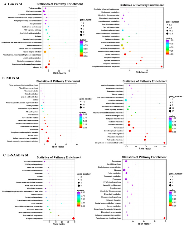 接下來,進(jìn)行了KEGG通路富集分析。氣泡圖展示富集最顯著的前20條通路(圖5A?F)。與M組相比,Con組上調(diào)的DEGs主要富集于以下通路:苯丙氨酸、酪氨酸和色氨酸的生物合成,亞油酸代謝,金黃色葡萄球菌感染,補(bǔ)體和凝血級聯(lián)反應(yīng),以及甲型流感病毒。ND組與M組相比,上調(diào)的DEGs主要富集在花生四烯酸代謝、金黃色葡萄球菌感染、移植物抗宿主病、吞噬小體等通路中,而ND組與M組相比上調(diào)的DEGs主要富集在以下通路:苯丙氨酸、酪氨酸和色氨酸的生物合成、亞油酸代謝、金黃色葡萄球菌感染、移植物抗宿主病、吞噬小體。在CON/M和ND/M比較中,下調(diào)的DEGs在相似的KEGG通路中富集:不飽和脂肪酸的生物合成、脂肪酸代謝、丙酮酸代謝、脂肪酸伸長、氧化磷酸化和碳代謝。