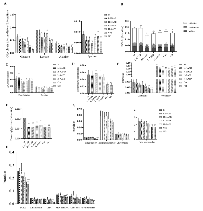 然而,ZDF大鼠中谷氨酰胺/谷氨酸比值對花青苷提取物無反應(yīng)(圖6D),但L-AAPP和H-AAPP降低谷氨酰胺和谷氨酸,H-NAAB降低谷氨酸(圖6E)。與M相比,所有花青苷處理組的二甲基甘氨酸升高的水平都被逆轉(zhuǎn)到正常狀態(tài)(圖6F)。與M組相比,編碼甜菜堿-同型半胱氨酸S-甲基轉(zhuǎn)移酶的BHMT均降低。在脂質(zhì)代謝產(chǎn)物方面,L-AAPP組和H-AAPP組的肝脂譜略有改善,表現(xiàn)為脂肪酸殘留量、包括ω-3脂肪酸在內(nèi)的不飽和脂肪酸和Ara+EPA的下降趨勢(圖6G?H)。M組顯示出總體脂質(zhì)譜增加,如高水平的磷脂、甘油三酯、脂肪酸和不飽和脂肪酸,所有這些都有助于脂肪肝的發(fā)展。L-AAPP和H-AAPP組通過調(diào)節(jié)脂肪酸殘基和不飽和脂肪酸略有改善肝脂代謝。